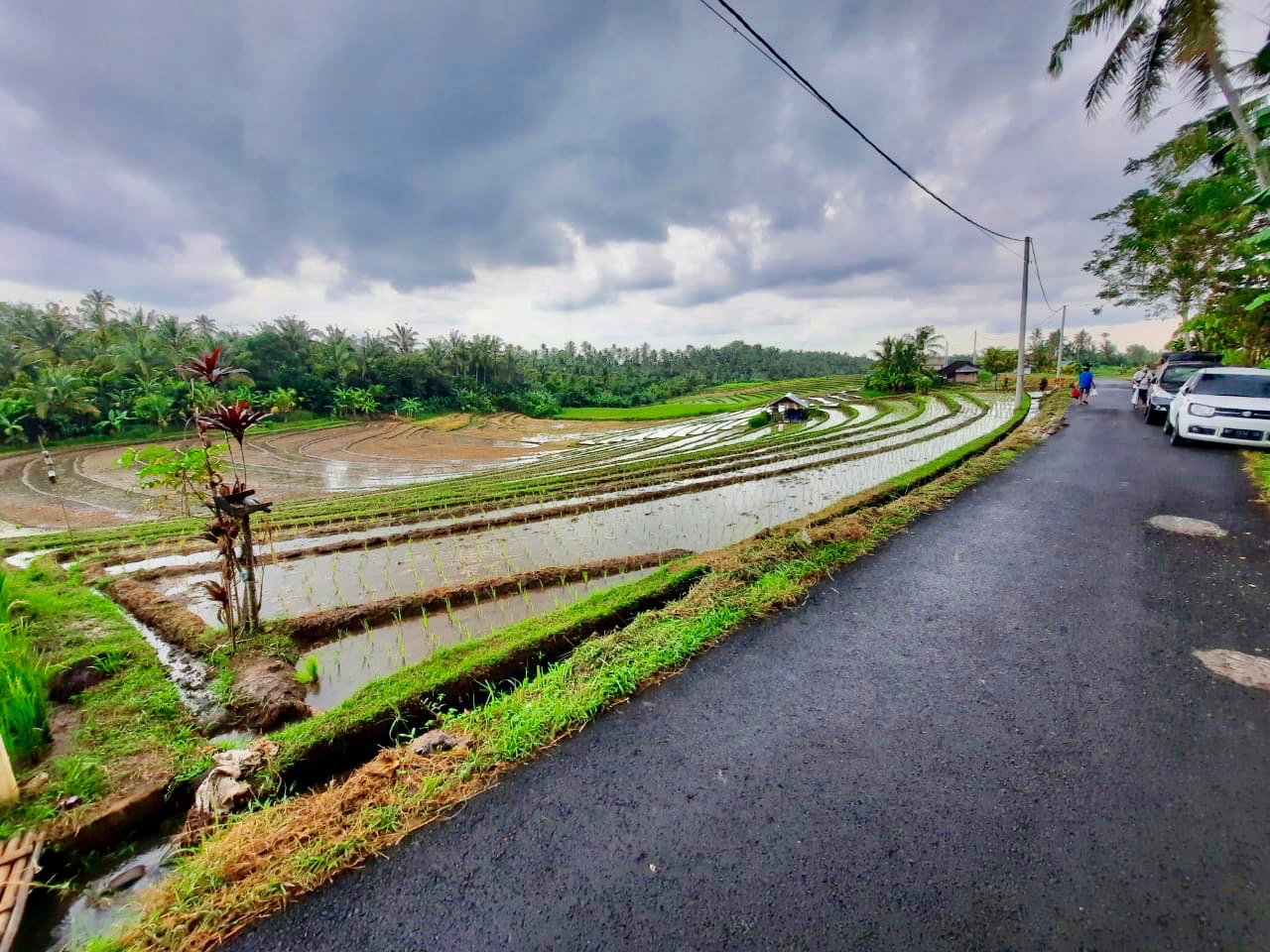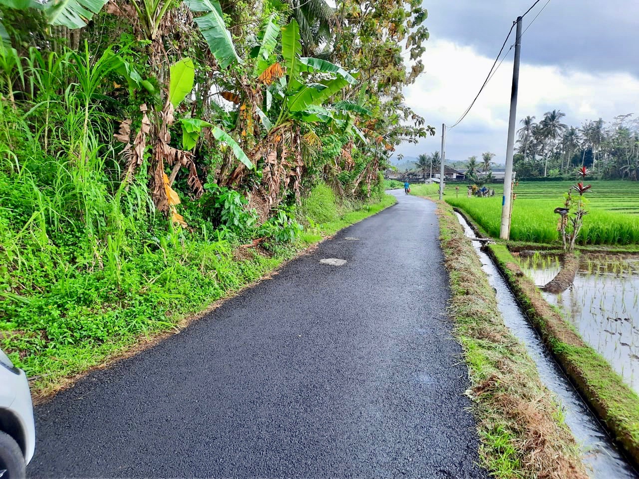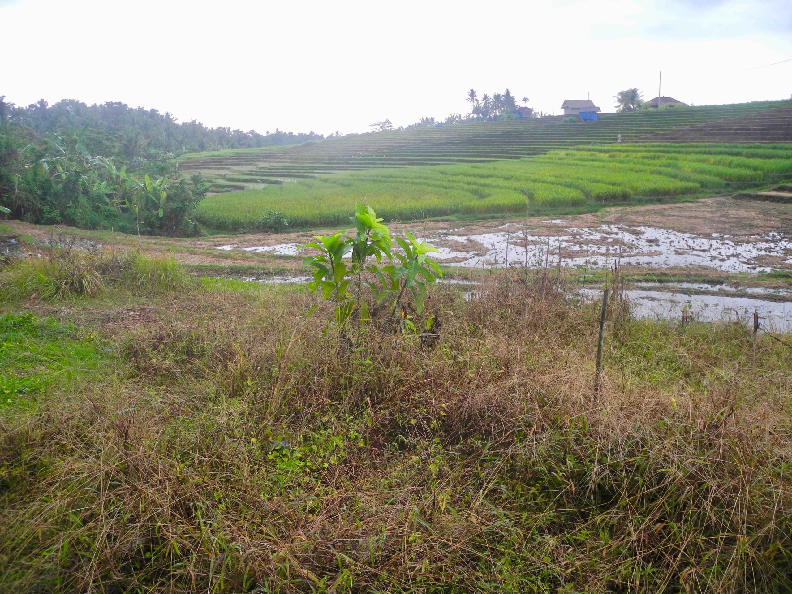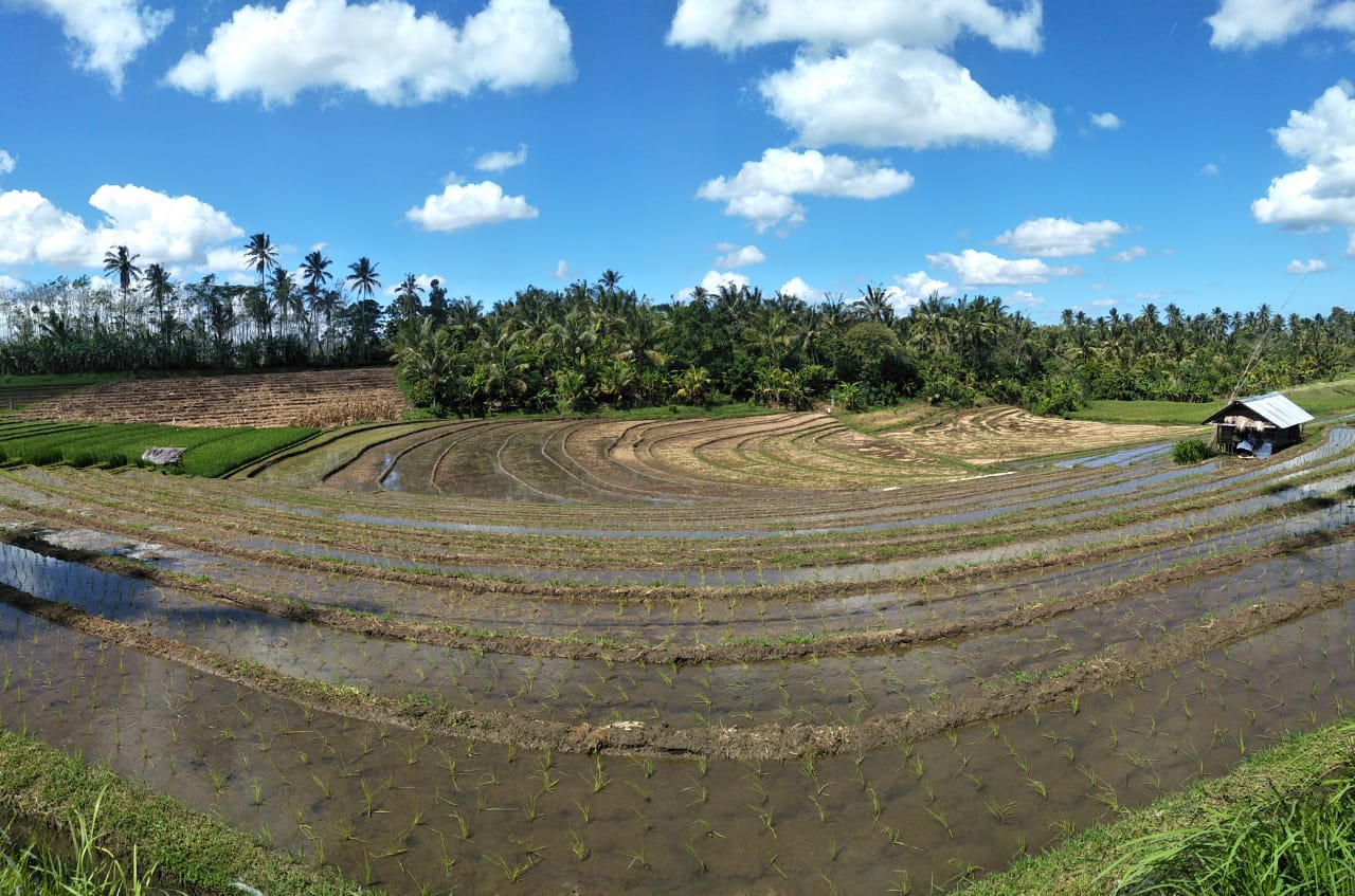 The land has excellent road access which runs the length of one side of the rectangular plot. From the road side to the west, the land slopes down to a large flat plateau which is square in shape. On the opposite side to the road, to the east of the plot there is the view of lush tropical vegetation. Then to the north and particularly the south there are stunning views over the rolling rice fields.