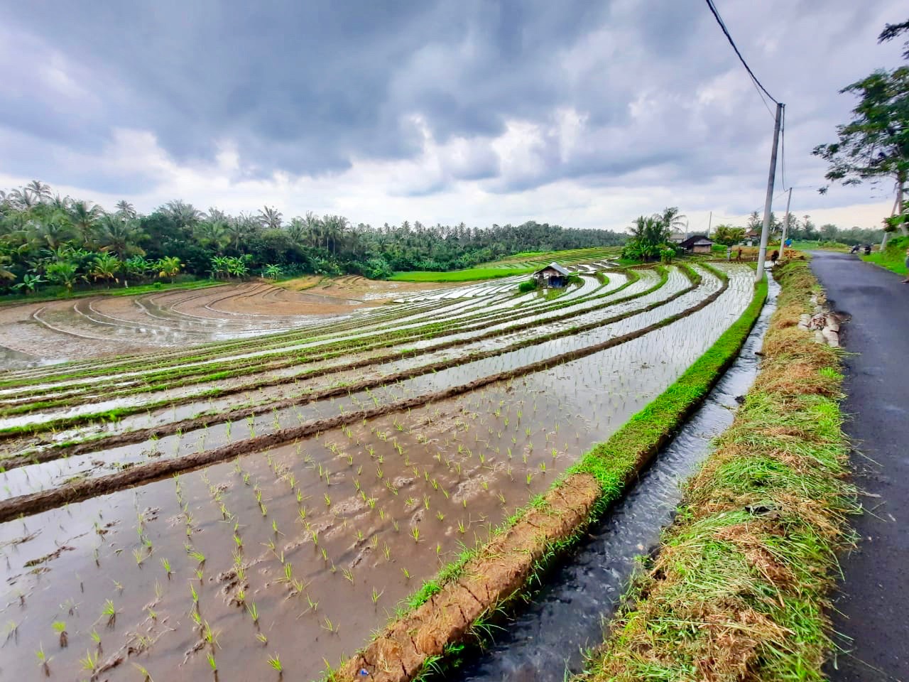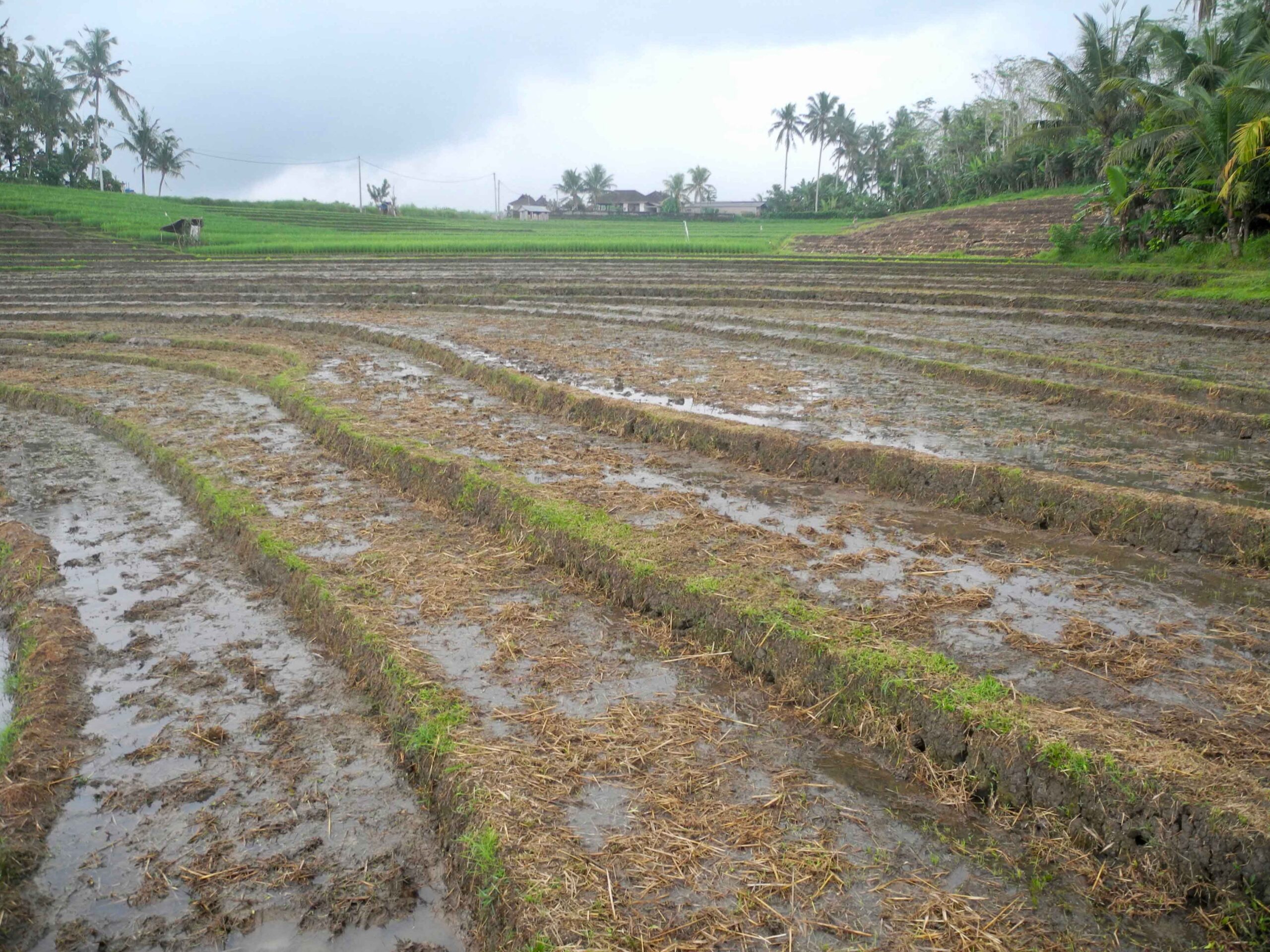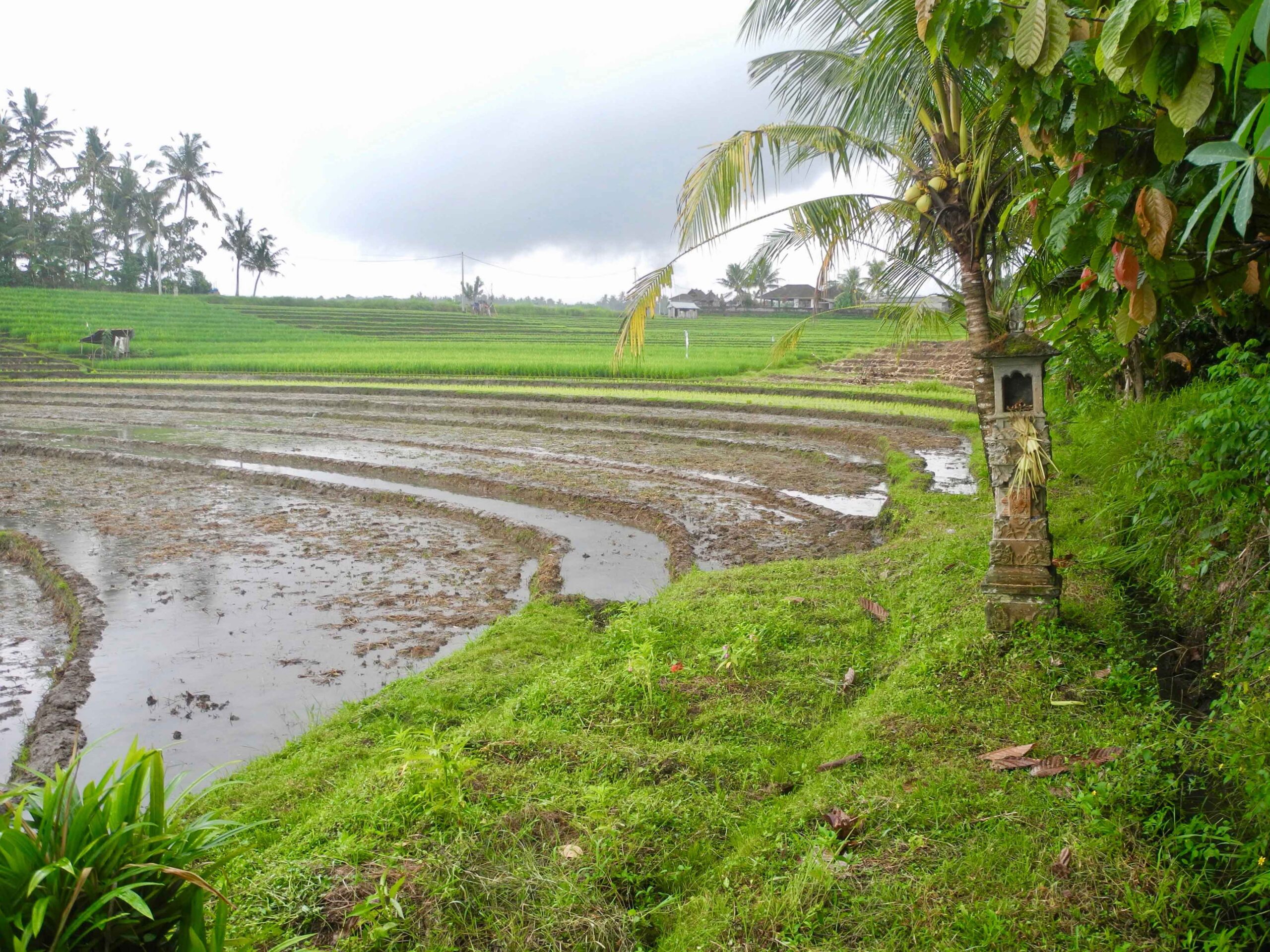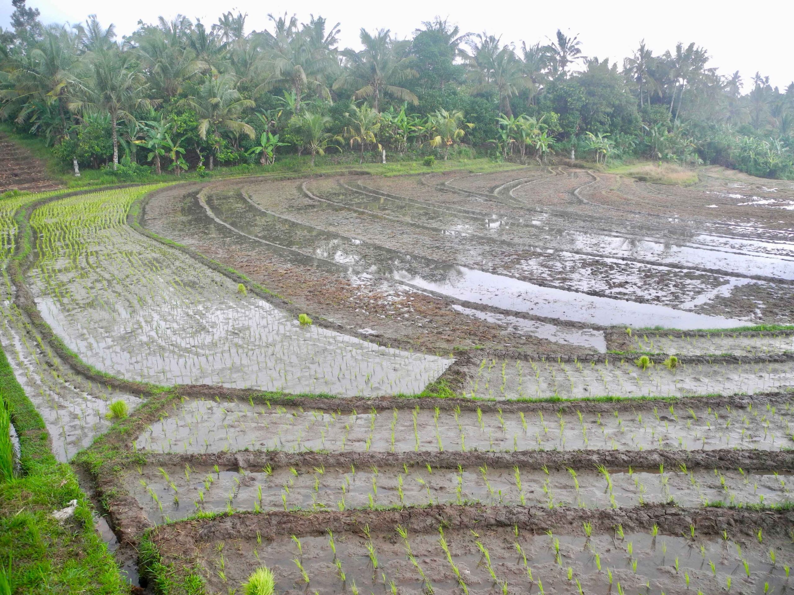 The land has excellent road access which runs the length of one side of the rectangular plot. From the road side to the west, the land slopes down to a large flat plateau which is square in shape. On the opposite side to the road, to the east of the plot there is the view of lush tropical vegetation. Then to the north and particularly the south there are stunning views over the rolling rice fields.