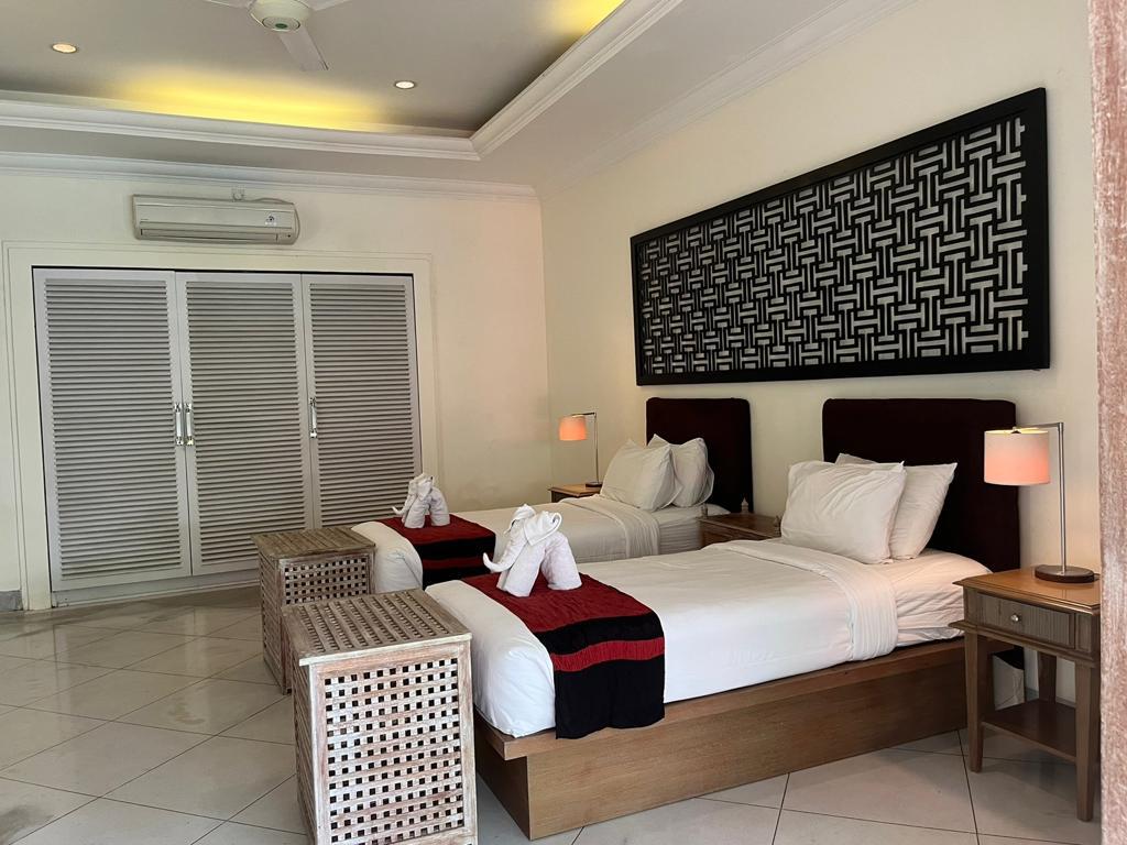 To the right of the living and dining area is the second master bedroom with ample size bathroom and bathtub. The adjacent guest room, twin bedded yet can be made into queen size beds, also have en suite bathrooms and all are accessed directly from the garden. The kitchen and wet pantry take up the rear part of the house along with staff quarters and laundry room. The two-car garage allows for off street parking.