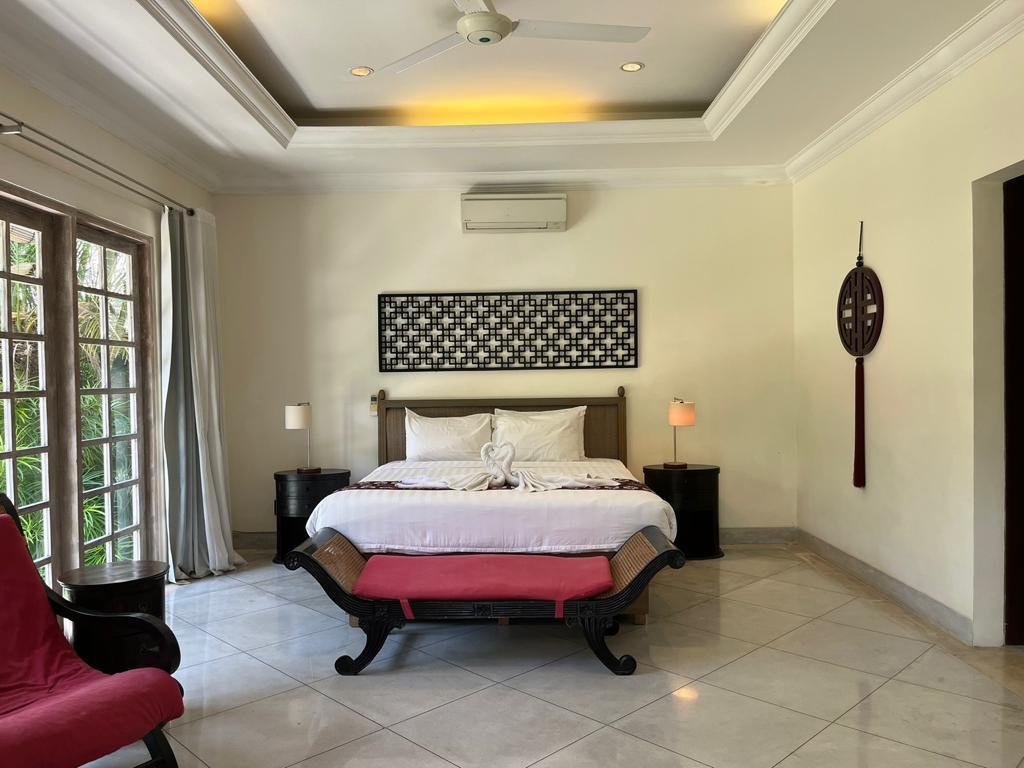 Carved double wooden doors open onto the entrance garden and the open living room beyond. This fabulous colonial style four-bedroom villa ranges over one floor and is set on a large 1,200 square meters (12 are) land plot. The living area looks out over the pool and bale (gazebo), through a line of palm trees and tropical landscaping. To the left is the media room, equipped with LCD TV offering cable channels and comfortably furnished with sofas and a small guest lavatory. Adjacent is one of the Master bedrooms overlooking the garden. The bedroom has a four poster bed, spacious bathroom with bathtub and walk-in closet.
